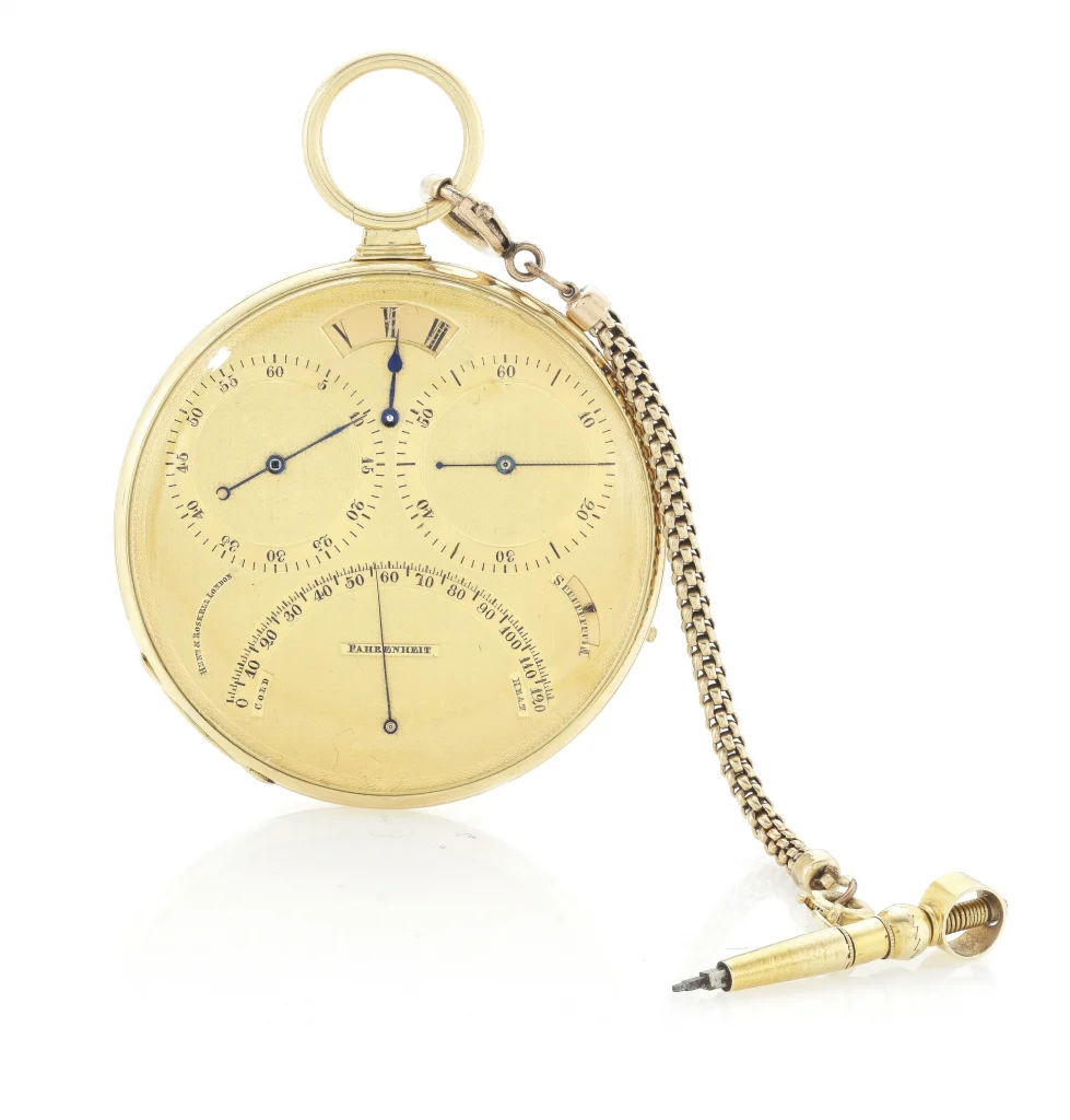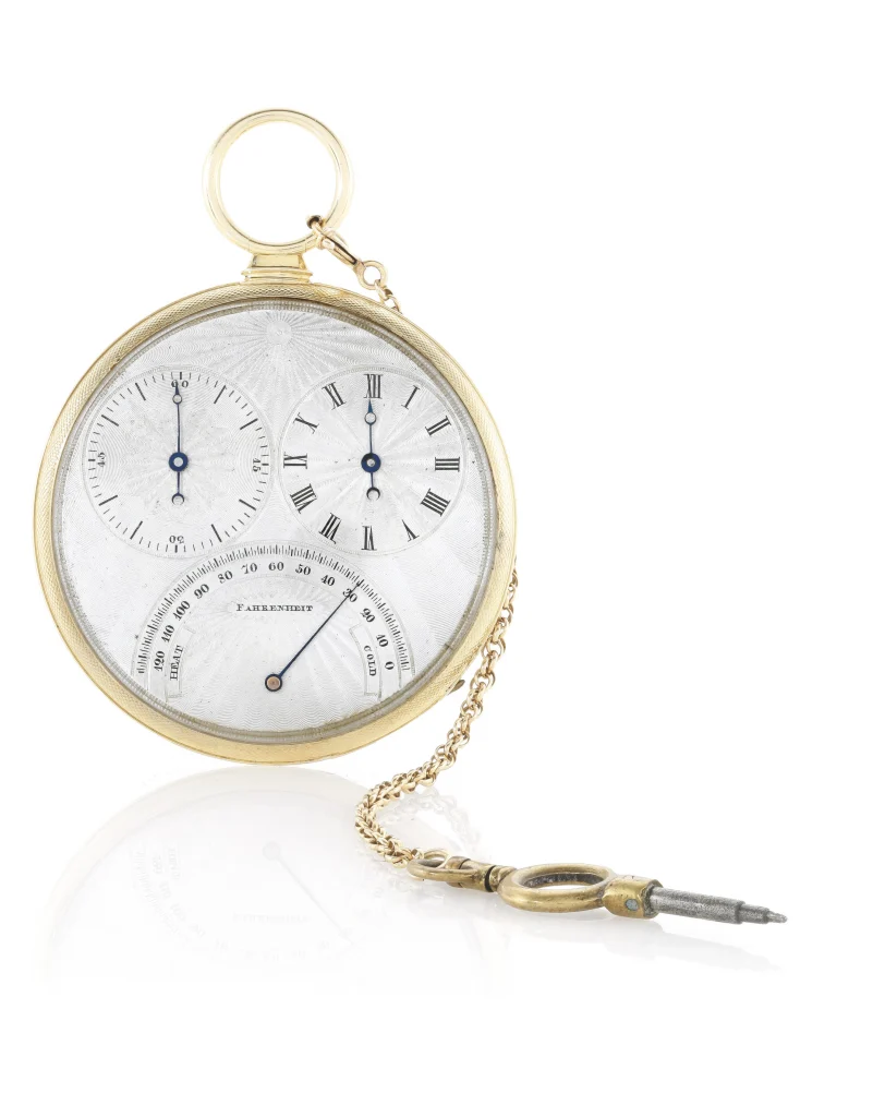 Ultra-thin Pocket Watch with lever escapement and regulator dial with hours, minutes, seconds, fast/slow regulator indicator and bi-metallic thermometer display in Fahrenheit