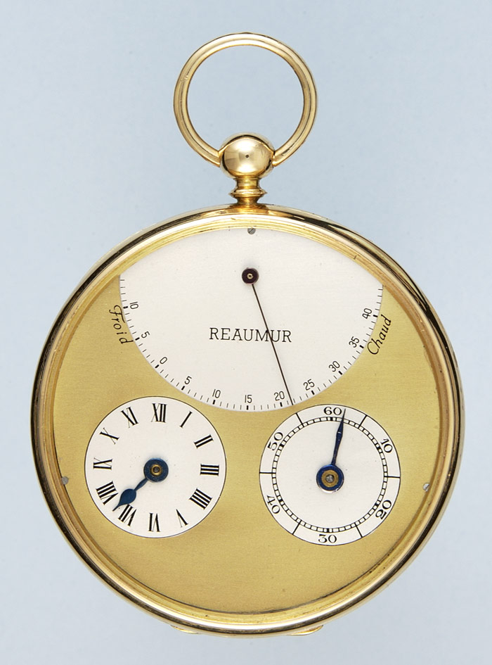 Ultra-thin Pocket Watch with ruby cylinder escapement and regulator dial with hours, minutes and bi-metallic thermometer display in Réaumur